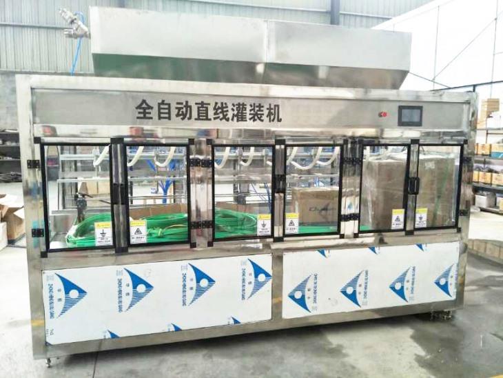 本机集洗涤、灌装、压盖为一体。整机采用直线灌装方式。不同容量的大瓶不需要替换配件,需少量调整可实现不同瓶型之间的转换。PLC控制,触摸屏操作,自动化程度高,整体框架结构,比较美观,适用于多种非气体液体的灌装。